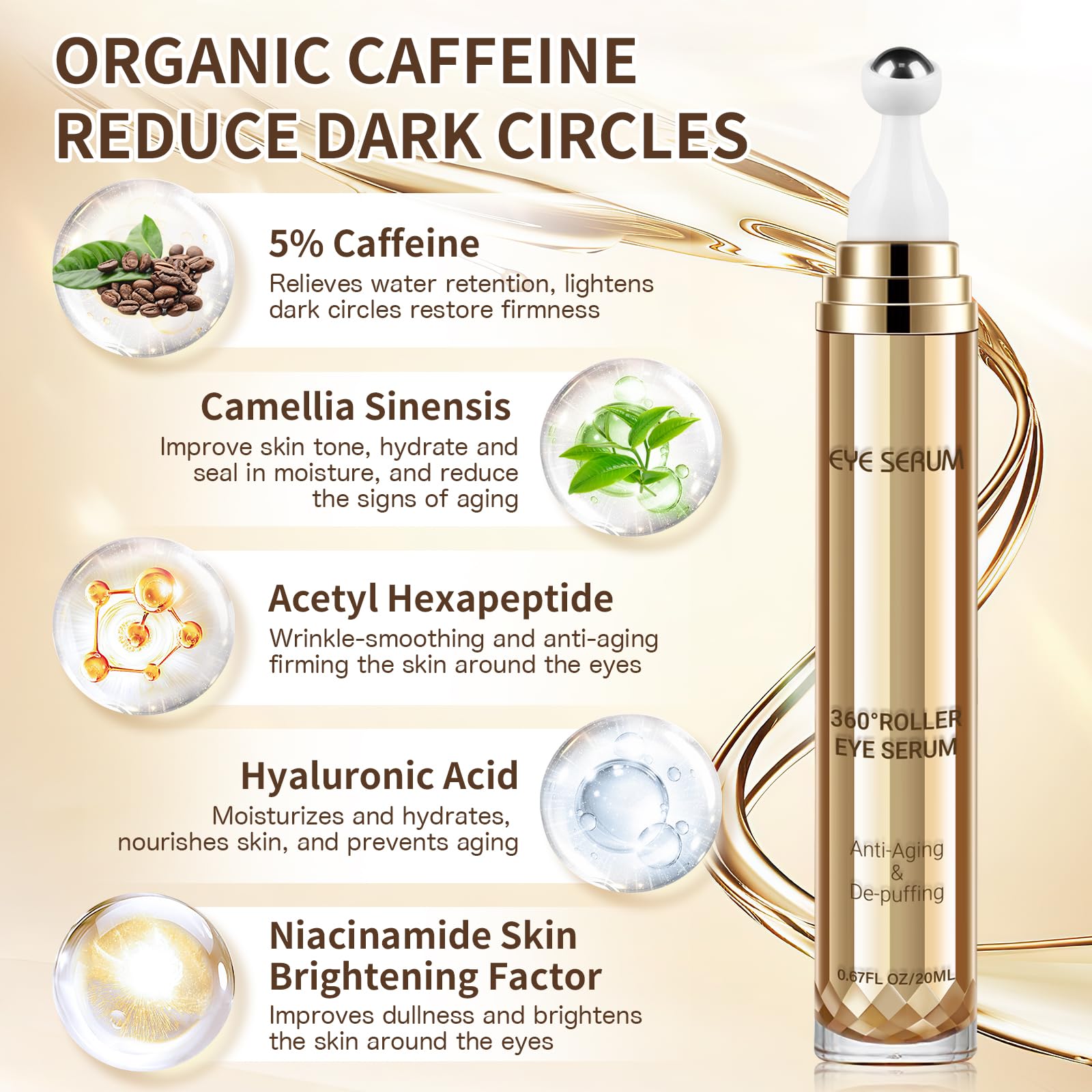 - 【Eye Care】: Our Caffeine eye serum is rich in acetyl hexapeptide, and make the skin younger. Wrinkle-smoothing and firming the skin around the eyes.